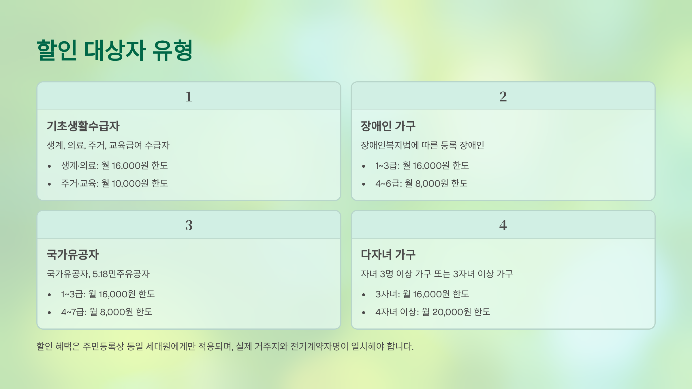 에너지 복지 차원에서 제공되는 이 할인 제도는 의료급여 수급자, 기초생활수급자, 차상위계층뿐만 아니라 장애인, 독거노인, 다자녀 가구 등 다양한 사회적 범주를 포함하고 있어요. 혜택은 월별 또는 연별로 적용되며, 자동 갱신은 아닌 경우가 많기 때문에 신청 주기를 잘 챙겨야 해요.